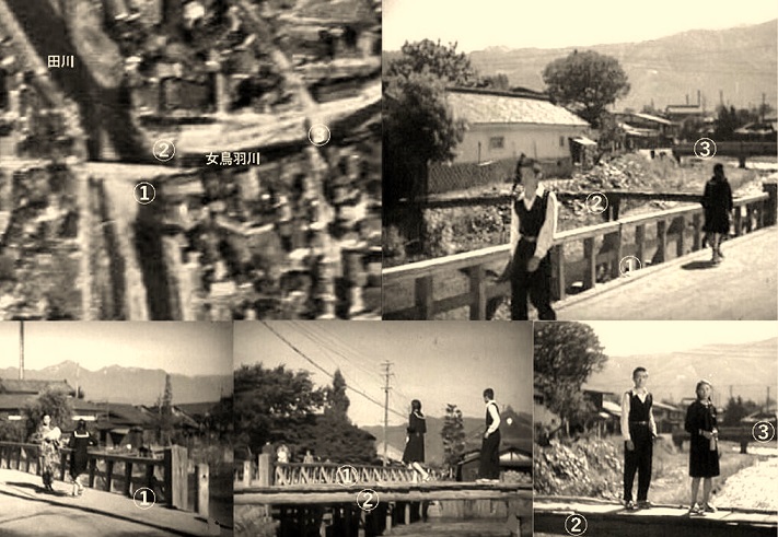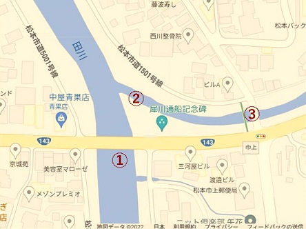 「田川大橋」(国道143号)附近の田川と女鳥羽川の分岐点ではないかとのこと。住所は松本市巾上5丁目。