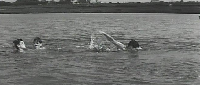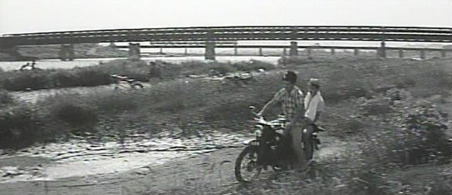 かぶと虫を探しに、昭太郎(夏木陽介)がオートバイで秀男(大沢健三郎)を乗せて来る 多摩川の河原。
