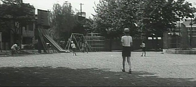 野球をやっている子ども達にどつかれて秀男が届け物のトマトを落としてしまい