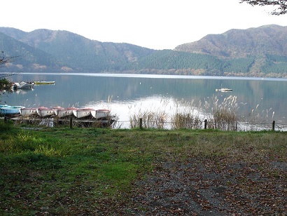 杏子が最初に岡田(藤木悠)、次に伊島を自転車で案内する、箱根・芦ノ湖北側の湖尻。
