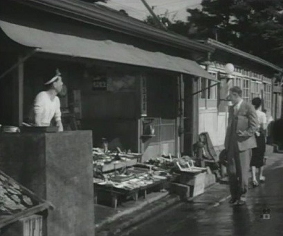 映画の冒頭、尾形信吾(山村聰)が鎌倉駅から帰宅する途中に立ち寄る魚屋。
