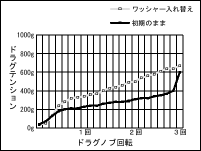 結果はこのとおり。以前はノブの中のスプリングが密着してしまってからやっと使用域に達する感じでしたが、スプリングが有効に働くようになりました。 ライン強度の1/5〜1/3にドラグをセットするなら、4Lb(1.8kg)で360〜600gとなります。この範囲がばっちり調整幅に入りました。 それにしても500と1000のドラグ構成は、設計者が勘違いしたんでしょうか・・・。間違えてくれたおかげで(働いていない)フェルトと耳付きが1枚ずつ入っていて、こんな改造も可能になったわけですが。(2006/10/30追記) |