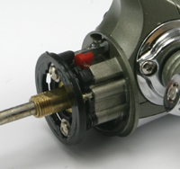 Mechanism Its worm shaft is supported by this way. I feel dangerous. The speed of the oscillation is too fast. The spool does one cycle only by about 1.1 turn of handle. |