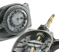 3ピースボディー 300とは構造ががらっと変わっています。8枚ギアから1対のベベルギアになりました。ボディーは3ピースで、上下対称。左右のモデルを同じ金型から作るのは300と同じ。 メインシャフト後端はボディーのレールで支持。 |