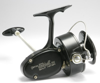 ミッチェル302 戦後すぐ300で成功したミッチェルの第2弾。1950年代初めに登場した海用大型の302です。写真は70年代のもの。300からはがらっと構造が変わっています。 スプール径72mm、自重557g(実測)、ギア比3.75:1、7号200m。いまの品番だと8000番くらいでしょうか。 |