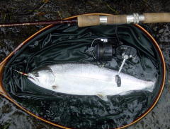 これは初めて長良川で釣ったサツキマス(というより戻りシラメ)です。アングリングの89年1月号に載った、この半端な写真に写っているのが、いまも手元にある408です。 |