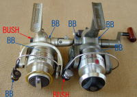 ベアリング配置 同じ3BBのシマノアルテグラとミッチェルプレステージです。海水浸入などでトラブルを起こしやすいラインローラーはブッシュにし、まず駆動系をがっちり固める。ミッチェルのほうが正攻法、そして実用主義です。 国産は、「ベアリング入りラインローラー」とカタログに書くことを優先しているのでしょう。 |