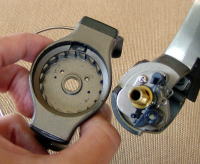 ノーマルストッパー これは97年登場のミッチェル230のストッパー。昔の大森や松尾カーディナルのようなシンプルな方式を採用しています。日本のメーカーなら絶対やらないでしょう。軽さや防塵性などを考えたら、いちばんいいんですけどね。 |