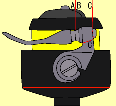 Line tangle This is a problem of 80's bail arm. A: The right position. B: The line runs on the collar. The line is twisted and makes trouble. C: The line winds on the nut. It cannot wind. |
