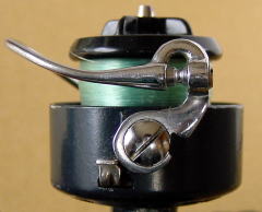 ローラーガイド2 80年代の初めにごく少し使われた、ベールが分割式になったローラーガイドです。写真のベールは4420のものですが、308と408にも使われました。軽合金製だった4400シリーズに対し、308と408のものは真鍮とピアノ線をロウ付けし、クロムメッキしてありました。部品が残っていないのですが、ベールアームは下のローラーガイド3と同じデザインなので、外観上はほぼ同じです。 ラインローラーはブッシュなしで、固定がナットではなくボルトである点が、ローラーガイド3と異なります。 |