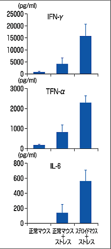 酸化コレステロールはそのまわりの組織に対する酸化作用によって交感神経優位の状態をつくり、血流障害と顆粒球増多を招く。ハイドロコルチゾン投与マウスの末梢血から血液を採取した炎症性サイトカインの濃度を比較した(図4)。コントロールマウスとステロイド投与マウスを12時間拘束ストレスにさらしたデータである。ストレスは白血球を刺激して、THFα(腫瘍阻止因子)、IFNγ(インターフェロンγ)、IL6(インターロイキン−6)の炎症性サイトカインを放出させるが、ステロイド投与マウスではこの傾向が極めて高い。
