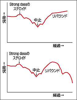 2つの図を出しているが、上図はステロイド離脱に反対するある大学教授の図という。しかし、深谷氏は下図の経過を辿ることが多いと述べている5)