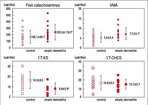 健康人とステロイド依存になったアトピー性皮膚炎で、1日尿中の総カテコールアミン、VMA(バニリルマンデル酸、カテコールアミンの代謝産物)、17-KS、17-OHCSを測定し比較した(図5)。総カテコールアミンとVMAが患者で増加し交感神経緊張状態にあることがわかる。血流障害や顆粒球増多の炎症に移っているのである。ステロイドホルモンの代謝産物である17-KSは低下し、17-OHCSにはあまり変化は認められなかった。
