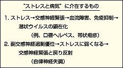 これまで精神的ストレス(心の悩みや不安)や身体的ストレス(働き過ぎや不規則な生活)が病気を引き起こすメカニズムとして、交感神経緊張によってもたらされる血流障害と顆粒球増多を強調してきたが、さらに介在する因子を挙げる必要がある(図4の1)。つまり、血流障害と免疫抑制によってもたらされる次なる現象、潜伏ウイルスの顕性化を考えなければならない。若い人でも老人でもストレスが加わった時に、それぞれ口唇ヘルペスが出現したり帯状庖疹にかかったりすることはよく知られたことである。