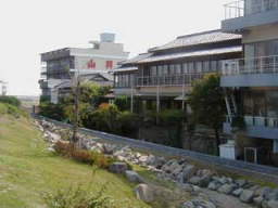 旅館街の堤防 御座船が着岸できた本陣跡に建てられた名門旅館も堤防の内側になってしまいました。 |