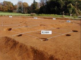 | 掘立柱建物跡 相柱の掘立柱建物、倉庫か | 方形周溝墓 弥生時代後期、遺跡南端にあり、まだ青いシートの中にも何基か存在しそう。 |