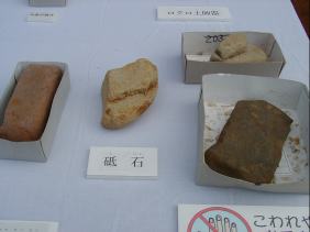 | 鍛冶に伴う遺物 左からふいごの羽口、右上鉄製品(斧の刃か)、右下の2つ鉄さい(鉄かす) | 砥石 鉄製品の加工に使用されたらしく、かなり使い込まれている |