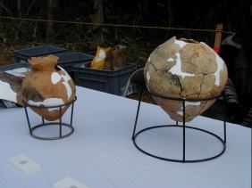 | 縄文時代晩期の瓶 斜めに埋めて土器棺墓として使用 | 弥生後期の壷 方形周溝墓から出土 |