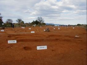 | 遺跡全景(遺跡南端から) 手前は弥生時代の方形周溝墓、遠方に多度山の稜線が見える | 鍛冶遺構 右中の馬蹄形の高まりが窯跡 |