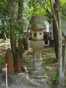 灯籠と砲弾 馬車廻し東縁に立つ灯籠と砲弾。砲弾は日露戦争の戦勝記念に大隈重信から 贈られたと伝えられています。 |