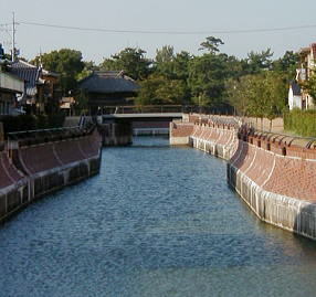 桑名城の外堀の一部で昔は船溜まりとして利用されていました。この堀はその後排水路の役目しかなく荒廃していましたが、国の高潮防潮堤の補強工事に伴って市でも台風時の漁船の避難場所として整備工事を進め、’01年煉瓦張りの護岸工事が完成しました。