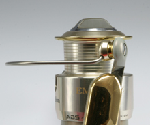 これがヒントです(というかまんまですが)。フリームスもこの部分にストッパーをつけています。カーディナル300やミッチェルアボセットなど、最近のリールはこのストッパーを採用するものが多くなっているようです。やはりこれがないとベールが破損するという証拠ではないかと思います。 |