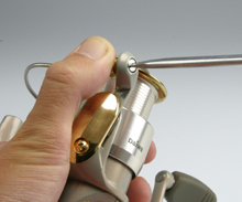 ここを目安に どのくらいのところで締めるのがいいかですが、ベールアームの状態とともに、この部分に適当な遊びがあるかも目安になります。ベールワイヤを水平にしたときは、スプールリングにつく寸前になっていました。 |