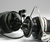 80年代のダイワなど ダイワ・ファントムEX800です。ローターの腕をベールと反対側にオフセットして、バランスを取ろうとしています。オモリを付けるより賢いやり方に見えます。同時期のリョービ、大森なども同じです。 |