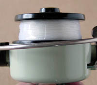 ちょっとまずいかも 糸巻き形状はまだ後ろ巻き。昔見た4(インスプール)も後ろ巻きだったから、こういう規格でやっているのか。わからんな。なお写真のリールはすでに、ピニオンベアリングの下に紙(前ページ参照)をかませています。 |