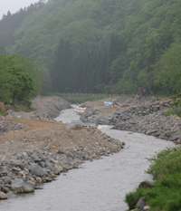 こちらその3一色川合流点上流です。この写真は日曜日なので水は澄んでいますが、平日は上の写真のようになります。 これらはほんの一部、あっちもこっちもこんなふうです。 昨年の台風による被害を復旧しているわけです。出水直後の状況を知らないのでなんともいえませんが・・・。 以上は庄川ですが、宮川など、全川こんなふうといってもいいくらい・・・。 |