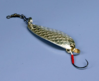 バイト7.5gDSWマスを釣ったバイト7.5gDSWです。フックといっしょに通してあるスプリットリングはトリプルフックとの重量差を補うため。いままでフックが軽くなるのを補おうとややアイを長めにしていましたが、このほうが動きがよいようです。 フックは下向きのほうが掛かりがいいみたい。ただ、底近くを釣るとすぐに針先がダメになるのがちょっと・・・。 |