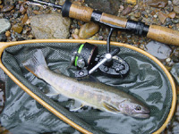2006年9月16日、九頭竜川支流のイワナです。今年、寄る年波に勝てず黄色い蛍光ラインを使い始めましたが、なんとなく不安なのでリーダーとしてフロロカーボンの1号を使っていました。でもこの日は、雨中の釣りでめんどうになり、途中から蛍光ライン直結で釣りました。昼からの釣りでエサ釣り師2人の後を釣ったため(と言い訳しておく・・・)、釣れたイワナは2尾でしたが、両方ともリーダーなしのときでした。蛍光ラインでも関係ないのか、リーダー付きなら2尾が3尾か4尾になっていたのか・・・。どっちなんでしょうね。 (2006/9/16)たぶん、魚は動くものに神経が行ってしまい、ラインが見えていても認識していないのではないかという気がします。カエルの目の前で雑草の穂のちぎったのをひらひらさせると飛びつくのと同じイメージ。ジュラシックパークのテラノザウルスも動くものしか認識しなかったでしょ。 蛍光ラインといっても、このとき使ったのは透明感のあるもの(バリバススーパートラウトアドバンスVEP)でした。不透明なものなら・・・とか考え出すときりがない、というか、その辺で悩むのも釣りの楽しみというか。 |