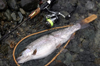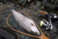 2008年4月12日、坂内川のニジマスです。釣れるはずのない魚がまた釣れました。おかしいなあ。コメットに巻いているラインはファイヤーラインEXT12Lb。この手の釣りにPEを使うのは初めてですが、写真くらいの巻き量ということもあってトラブルはありませんでした。メーカーはバークレイ。ミッチェルやアブを買収して台無しにしているにっくきアメリカ帝国主義資本です。ならなんで使うんだというところですが、罪を憎んで糸を憎まずということにしときましょうか。なんじゃそら。 (2008/4/13)入漁証を売っている所で聞いたらニジマスは10cmくらいのを5kg(バケツ一杯・・・)だけ入れているそうです。でもこの魚も2週間前のもヒレが欠けている(高密度で養殖するとケンカしてこうなる)ので、養魚場で成長した魚のようです。それに放流サイズもこのサイズとの中間の魚も釣ったことがありません。謎です。 PEといえば、出始めのころ(15年以上前)強度表示だけ見て「こんなに強いのか!」と飛びついて、パッケージに書いてあったオルブライトノットでナイロンリーダーを結び、いきなり九頭竜川に行ったことがあります。そして、(なんと)ヒットがありロッドがグングングンと3回締め込まれて結び目が飛びました。PEの結節弱さがまだ知れ渡っていなかったころでした。なんだったんだろうなああの魚は・・・。PEをなんとなく敬遠してきたのはこれがあったから。 ファイヤーラインには3号ナイロンをFGノットで結び、その先にフィールドメイト1.5号をサージャンズノットでつなぎました。FGノットが切れたら現場でやってられませんからね。最初はフロロ2.5号を結ぼうとしたのですが糸自体が硬いので抜けてしまいました。結び手が初めてでヘタだったのもありますが、ナイロンのほうが軟らかい分PEのくい込みがよいようです。 太さは0.8/1号表示ですが、スプールに巻いた“かさ”はナイロン1.5号相当です。GT-Rトラウト6Lb1.5号100mと入れ替えてほぼ同じ。以前買った国産のPEライン1号はダイワ2506(ナイロン1.5号100m)に100mがあふれ気味(モノによる)だったのでこんなものでしょう。 PEで心配なのはリールやガイドの磨耗ですが、あれは編目に砂塵が入るからなのでコーティングPEは大丈夫じゃないかなあと思っています。コーティングが取れてきたらどうしようかなというところ。 以前雑誌の取材でPFJに聞いたらコーティング剤はコーティングへの影響が未知なのでおすすめしないということでしたが、リールへの影響も考えてサンラインのパワーアップラインコートをかけました。少なくともコーティングが溶けるようなことはないようです。 なぜこの糸を持っていたかというと、雑誌の記事のためにメーカーに話を聞く際、手元に現物があったほうがよかろうと釣具店で買ってきたからです。これは取材経費として編集部に請求するべきだったのであらうか(使っちゃったからダメか)。 |