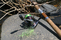 これはですね、いま売っているアングリング・ソルトのメンテナンス記事(ホント最近こればっかやってるような気がする・・・)に使ったハンドルノブの注油写真です。実は私はBB入りのハンドルノブには普段まず注油しません。単純に考えてもここの回転数はピニオンの5〜6分の1、ラインローラーの数十分の一ですから、油切れなんて起きるはずがないからです。でも撮影中に写真のように吹いたら上手くオイルが回ったので、これでええやんと思って、こういう注油法を書いておきました。ところが、この原稿を出した後に買った11ツインパワーC2000HGSの取扱説明書を見たら、オイルで溶けるからノブにはオイルが付かないようにして、もし付いたら中性洗剤で洗うようにと書いてありました。アングリング・ソルトに書いてある通りにした人がいたら、ノブ洗ってね。本を買ったみなさんスミマセン(立ち読みの人は知らん)。(2011/4/4)
