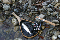 ダイワリールに合わせて引っ張り出したのは、なつかしのアモルファス・ウィスカー・ファントムAWS504ULFです。このロッドを買ったのは1987年の4月、と書いて気がつきました。S社に入った直後、初任給で買ったようなものです。いまさらながらとんでもないヤツです。 とはいえ、当時シマノ(伏字にしてもしょうがない)にはこういうルアーロッドがなかったのです。当時のルアーロッドはファイティングロッドというメガホンブランクのバスロッドだけだったのです。当時まだフライロッドもシーバスロッドもありませんでした。 で、5月の連休(いや夏ごろだったような気もする)に輪行して尾越カントリーレイクに行ったとき、このロッドを持っていきました。まだクルマは持っていませんでした。湖西線の駅で降りて、161号を走ってから山を登りました。途中、琵琶湖に流れ込む川にハス(ケタバス)がいっぱいいて、マスターアングラー5gを投げたものの1尾掛かってバレただけだった記憶があります。 学生のころ使っていた5万分の1地形図を見たら、161のほうから尾越村へ回りこむ道があと少しでつながりそうになっていたので、もうつながっているだろうと決めつけてそちらへ向かったのですが、はたして道は途中で消えていました。おかげで、いったん山を下りて再び別ルートをほとんど自転車を押して登ってやっとのことで尾越カントリーレイクに着きました。つながりそうでつながっていなかった道は、その両側にある集落の仲が悪くてつなげないのだということでした。 朽木渓流魚センターに初めて行ったのもこのロッドでした。あれはクルマで行ったのですが、まだいまのような池ではなくてひとつ池が出来ただけのころでした。場所もいまのところだったのかどうか、記憶があいまいです。まだエリアフィッシングが盛んでないころでしたし平日休みの日で、釣り人は私ひとりでした。 管理人さんに料金を払って池に案内されました。水が澄んでいたので、水辺から離れて身をかがめて最初のキャストをしたのですが、そのためにロッドティップが水辺に配置してある大きな石を叩いてしまいました。ティップを見るとSiCリングが割れています。養魚場育ちの魚は人影をそれほど恐れないのに、何をやっているのやら。こんなときに限って、予備のロッドを持ってきていません。 お客が私ひとりだったこともあって、管理人さんはどこかへ行ってしまっていました。今のような事務所・休憩所はありません。それに、いったんお金を払って、やっぱり帰るから返してというのはまずいかなあと、3500円だか3800円だかの料金を払ったまま1投もせずに、とぼとぼと堺へ帰ったのでした。 帰ってからロッドは泉北1号沿いにある釣具店に修理に出しました。数日で直ったという連絡があり、いやに早いなと受け取りに行くと、オリジナルのガイドではなく磯上物竿に使う小さなトップガイドが付けられていてスレッドがニスか瞬間接着剤で固めたようになっていました。これおかしいよと指摘すると、店はしぶしぶ再び受け取りました。 しばらくして、今度こそロッドは元通りになって返ってきました。釣具店いわく「ダイワの営業マンに仕上げが汚いってしっかりいっときました!」ということだったので、私はダイワの営業の人が自分で修理したのかなと思っていました。でも、いまにして思えば営業マンが営業所に帰ってからしこしこ竿やリールの修理をするとは思えませんし、最初の修理が早すぎました。最初の修理は釣具店自らが振り出し竿のトップを替えるような感覚でやったのかもしれません。じっさい、使用されていたトップガイドはそうしたガイドでした。それをメーカーのせいにするとは、いまさらながらふてえ野郎です(そうそう、あのころ、ダイワの大阪(堺?)営業所が独身寮から会社までの途中にあったんじゃなかったかしら。えらいところにあるなと思ったものです)。 とまあ、このロッドにもいろいろと思い出があるのですが、大物を釣った話が出てこないのは、私の不徳のいたすところであります。 |