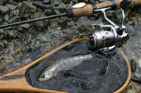 2013年2月24日、またしても放流アマゴをひろってきました。釣れん九頭竜より放流ものだぁ。ルアーは貴重なマスター5gS。昨年12月に諭吉さん2人を広島に派遣してスプーンを注文したのですが、半月経っても届かず、もしや郵便事故かと電話したらなにやら売り上げ好調で塗装が追いつかずもうちょっと待ってとのこと。暖かくなるまででいいですといったら、届いたのは先週でした。しかも、頼んだスプーンのうちマスター5gはブランク切れで写真のルアーは結局岐阜の上州屋で買ったもの。忠さんのスプーン・イコール・バイトで、マスターとかダムサイド、ギンザンは少数派みたい。ことごとく私の欲しがるものはマイナーです。 (2013/2/25)