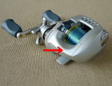 ここさえ変えれば でも上の写真のように握って強引に投げると(もちろん手首の柔軟さが死んでへたっぴキャストになりますが)、“振りバランス”はいいのに気づきます。ギアとハンドルの重量部が手首に近いからです。 すなわち、左の写真の矢印部を低くして、人さし指をトリガーに掛けてもスプールに親指が届くようにさえすれば、このリールは普通のベイト以上に投げやすいリールになる可能性があるのです。 |