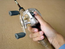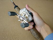 普通に握ると…… で、取り説を無視して普通にトリガーに人さし指を掛けると、親指がスプールに届かない! 広告でダイワのバスプロさんが、人さし指をロッドに添えるへんな投げ方をしていたので、嫌な予感はしていたのですが…… 釣り具って、まず普通に使えるようにするのが大前提では? |