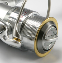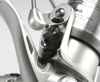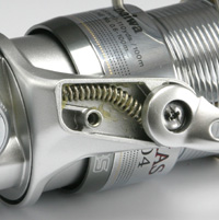 シュアトリップベール いわば、半内蹴り機構です。80年代終わりの輸出用ロングスプールPR-Hやその国内版スポーツラインGS-Hから使われています。でも、感触は完全に外蹴りです。懐かしい外蹴りの味を残している・・・なわけないか。 その点はいただけませんが、ベールアームの反対側の腕にベール返し機構を仕込むのは、ローター軽量化において有効で、まじめな設計だと思います。これを含めてローターを軽くしようという基本方針も、実に正しい。 |
