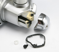 メインシャフトとパッキン メインシャフトとピニオンのすき間に異物が噛み込まないようにするパッキンです(写真は浮かせています)。これは以前雑誌の記事のために借りたトーナメントエアリティーにも付いていました。メインシャフトは軽合金のようです。 これに限らず、ほとんど装備面はエアリティー同等。お得というか、エアリティーオーナーの立場は・・・というか。 |
