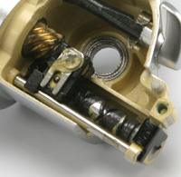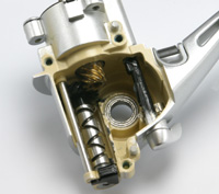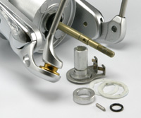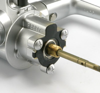 ハンドル コルクコアの軽量ノブです。ローターと並んで回転慣性を減らそうという考え方がこれまた実に正しい。しかも、慣性モーメントに一番きくのは最外周にあるノブです。まったくもって、正攻法。 いっちゃあなんだけど、04ステラってハンドル軽量化のためにクランクを中空にしながら、ノブは昔のまま・・・。 ハンドルノブの支持軸(ダイワではハンドルリベットというらしい)も軽量化のために軽合金です。シマノは耐蝕性のためにステンレスを使ったモデルが多い(軽合金は記憶にない)ですが、常識的な使用を考えたら軽いほうがいいと思います。 余談ですが、シマノはハンドルノブ支持軸に真鍮を使いません。耐蝕性なら真鍮で十分のはずなのですが、実はこれ「同質は焼き付く」という社内迷信に縛られてるんですね。真鍮の支持軸は真鍮パイプを使ったウッドノブ(最近あまりないけど)との間で焼き付くはずだというのです。でもさ、真鍮系同士が悪いなら、ベイトのギアなんてもろ真鍮系同士でしょ・・・。実際、ダイワには真鍮のハンドルリベットと真鍮パイプのウッドノブのリールもありましたしね。昔偉い人が言ったとか、そういうのがけっこう残ってるんですね。 |