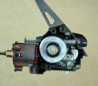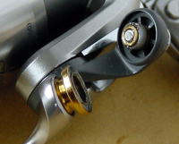Large diameter spool Its aluminum spool lip of gold colored is not good idea. But its original was Shimano... It can reel 65cm per 1 rotation of handle in spite of 4.7:1 ratio. It is a effect of large diameter 45mm spool. The rotation is stable. It is still good although the lip should be straight like Zebco , Mitchell , ABU33/44 , Lew etc. |