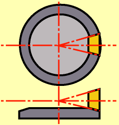 ベベルギアのかみ合わせ ベベルギアを摩擦車に置き換えると、この図のようになります。 ギアが円すい形をしていて、両方の頂点はギアの軸が交差するところにきます。 この摩擦車なら、摩擦面でスリップは起きません。 |