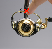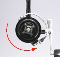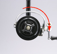 当たり始め ストッパーをオフにしていると、ローターがぶらぶらする分キャスト時のベール返りが起きやすくなるリールもあります。308はベール返しアタリの位置で、ベール返りを起きにくくしています。 308などの場合、このように、普通のリールと比べると90度くらい早めに当たります。 |