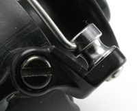 ベール返し部 ベールを開いたときベール返しレバーをかける部分は、カーディナルやミッチェルとは逆の支点に設計。これによって重量を分散しています。インスプールですからベールは手で返せませんが、レバーは厚めで“熊の手”にも曲げられにくくなっています(それでもネットオークションに出ているインスプールリールの中にはベールワイヤを思いっきり曲げられてるのがありますからねえ・・・頭の中が熊以下の人がいっぱいいるようです)。 ただ、欲を言うなら、レバーをかけるプレートは樹脂など軽いものにして、重みを持たせるのはネジの頭にしたほうが、ベールを閉じる衝撃が小さくなるでしょうね。インスプールでは起きないでしょうけど、ベールワイヤの疲労破壊の心配もより小さくなるでしょう。カーディナル33はそういった設計です。いま言っても仕方ないけどね。 |