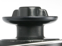 スプール スプールは硬質アルマイト処理のアルミダイキャスト。エッジの形はいまひとつ。いっぱいに巻くとライントラブルを起こすので、8分目に巻くことになり、結果的に小さいスプールと同じことになってしまいます。これは惜しいところ。 |