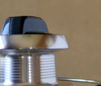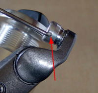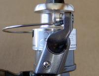 おっ 指で写真のように押してみると、ベールがほとんどたわみません。これはベールアーム(アームカム=ラインローラー側の支点)側だけでなく、こちら側にもストッパーが入っているからです。 この部分のストッパーは、ダイワはフリームスから付けました。シマノは少なくとも98までは未装着。ミッチェルは308Xからです。アブ302は付いていました。 以上は私の所有リールを見た結果ですが、クァンタムがかなり早い時期からこの部分にストッパーを入れていたのはたしかです。 |