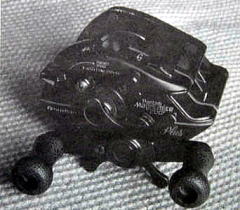 バンタムマグナムライト2000GTプラス チタンやジュラルミンを使って軽量化したマグナムライト2000GTは84年に登場し、190gの軽さを誇りました。 写真は翌年(翌々年?)に出た、ドラグロック付きの「プラス」です。レバー操作でドラグがロックされますが、ロック機構やロックの際の衝撃に耐えるための強化により、224gに重くなっていました。せっかく軽量化したのに、使うか使わないかわからないもので、その努力をだいなしにしたともいえます。 |