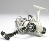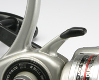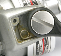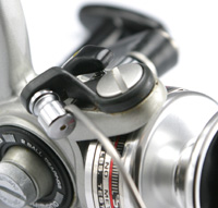 まだノウハウが蓄積していないためのトホホな部分と、妙にこだわった部分が同居しているあたり、黎明期の製品らしいなあと思います。 たとえば、ベールアームを止めているネジもアルミ削り出しです。お金がかかっているだけでなく、コインで外せますし、ベールアームのがたつきを止める効果も大きいでしょう(ステラの六角穴つきボルトよりずっといい)。 樹脂複合のハンドルクランクも新しい試みといえないでしょうか。 |