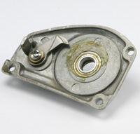 内部機構 ストッパーはメインギアの背部に爪を掛けるタイプ。まだサイレントストッパーが生まれていないのでカリカリと音がします。まだこのころピニオンに掛けるタイプは小数でした。 スプール往復はリダクション(減速)方式です。当時まだハンドル1回転で1往復のリールしか使ったことがなかったので、ものすごく高級品に感じました。 メインギア右はボディーに埋め込まれた真鍮ブッシュで受けています。 |
